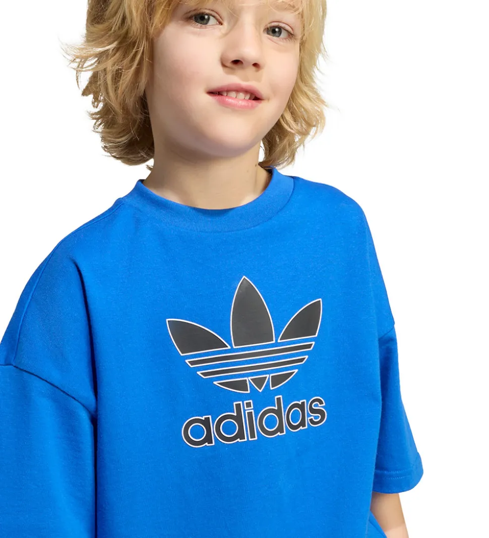 Nydelig adidas Originals shortssæt bestående af en t-shirt og et par sweatshorts i en klar blå farve. Shortsene har et enkelt design med det ikoniske adidas logo på benet, og t-shirten har et stort, sort logoprint fortil i sort med hvid kontrast.