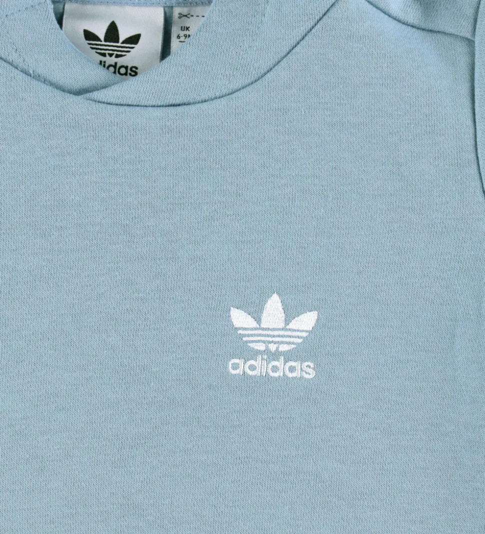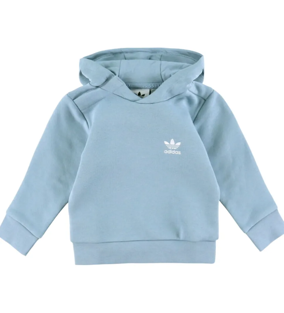 Lækkert adidas Originals sweatsæt i lyseblå. Sættet består af en hættetrøje og et par sweatpants.