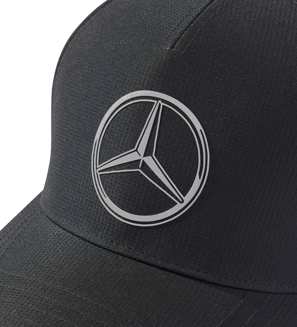 Smart adidas Performance kasket i sort, og fortil er der refleksprint med et Mercedes-logo.