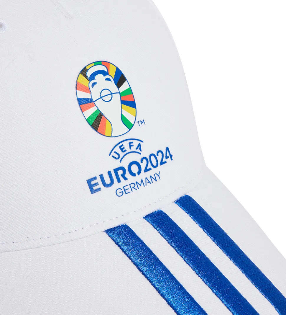 Smart adidas Performance kasket i ensfarvet hvid, med et Euro 2024 print fortil samt tre striber broderet i blå langs skyggen. Bagpå til venstre er der et blåt logoprint.
