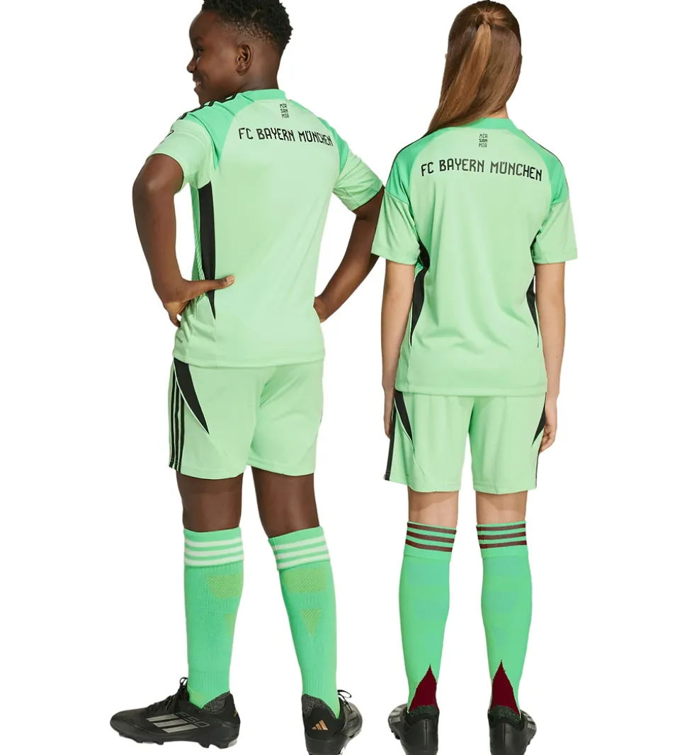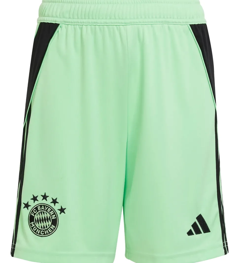 Seje adidas Performance shorts i neongrøn med sorte detaljer, og nederst på højre bukseben sidder der et logo fra den tyske fodboldklub FC Bayern München. Shortsene er inspireret af holdets udebane-målmandsshorts i sæsonen 25/26.