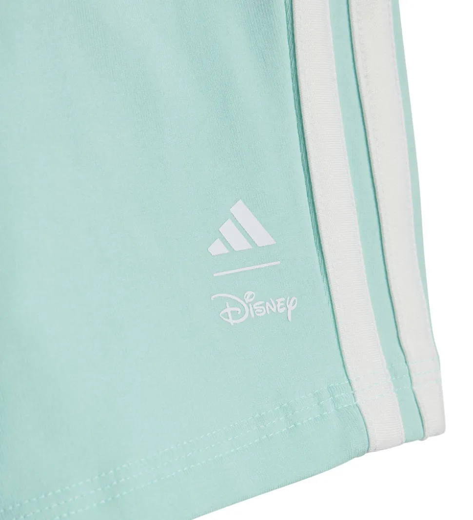 Smart adidas Performance sæt, der består af et par shorts og en t-shirt. Sættet er mintgrønt, og t-shirten har en alloverprint af Stitch der surfer i blå nuancer.
