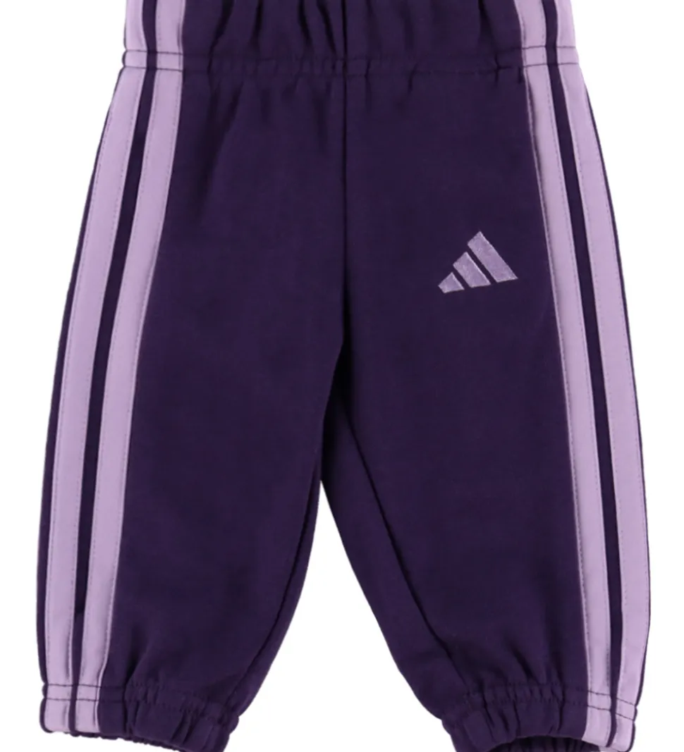 Flot adidas Performance sweatsæt, der består af en sweatshirt i lys lilla og et par sweatpants i mørk lilla med logostriber i kontrastfarver.