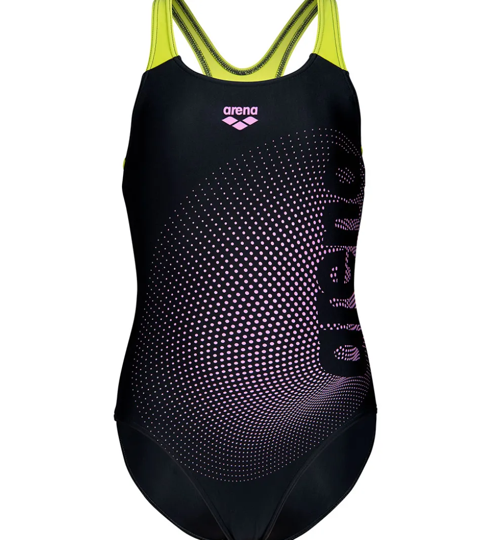 Smart Arena badedragt i sort med et iøjnefaldende mønster af små prikker, der danner en bølgende effekt på forsiden. Kontrasten mellem det sorte og det lyserøde mønster giver en dynamisk fremtoning. Skulderstropperne er neongule.