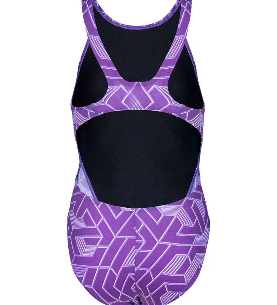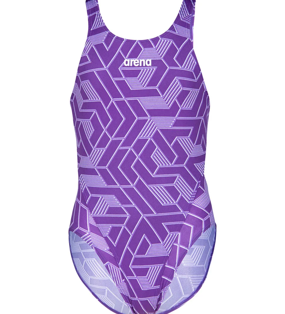 Smart Arena badedragt lilla med et geometrisk mønster af vandrette linjer og vinkler, der skaber en dynamisk effekt.