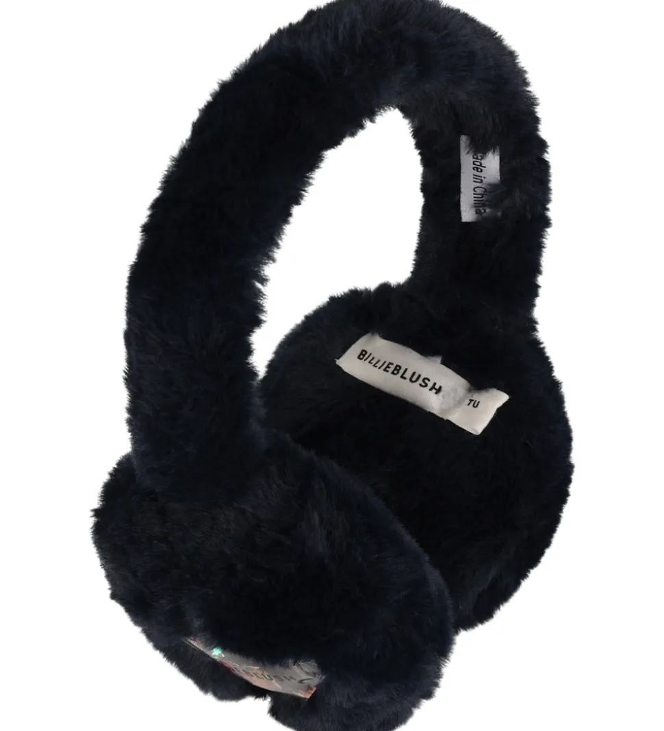 Flotte Billieblush ørevarmere i en dyb navy farve. Ørevarmerne har en blød, plysset tekstur, der dækker både bøjle og ørestykker. En smuk stjerne og et sødt hjerte med små multifarvede stjerner indeni pynter på ørestykkerne, hvilket tilføjer et stilfuldt touch. Ørevarmerne kombinerer funktionalitet og elegance, som kendetegner Billieblush.