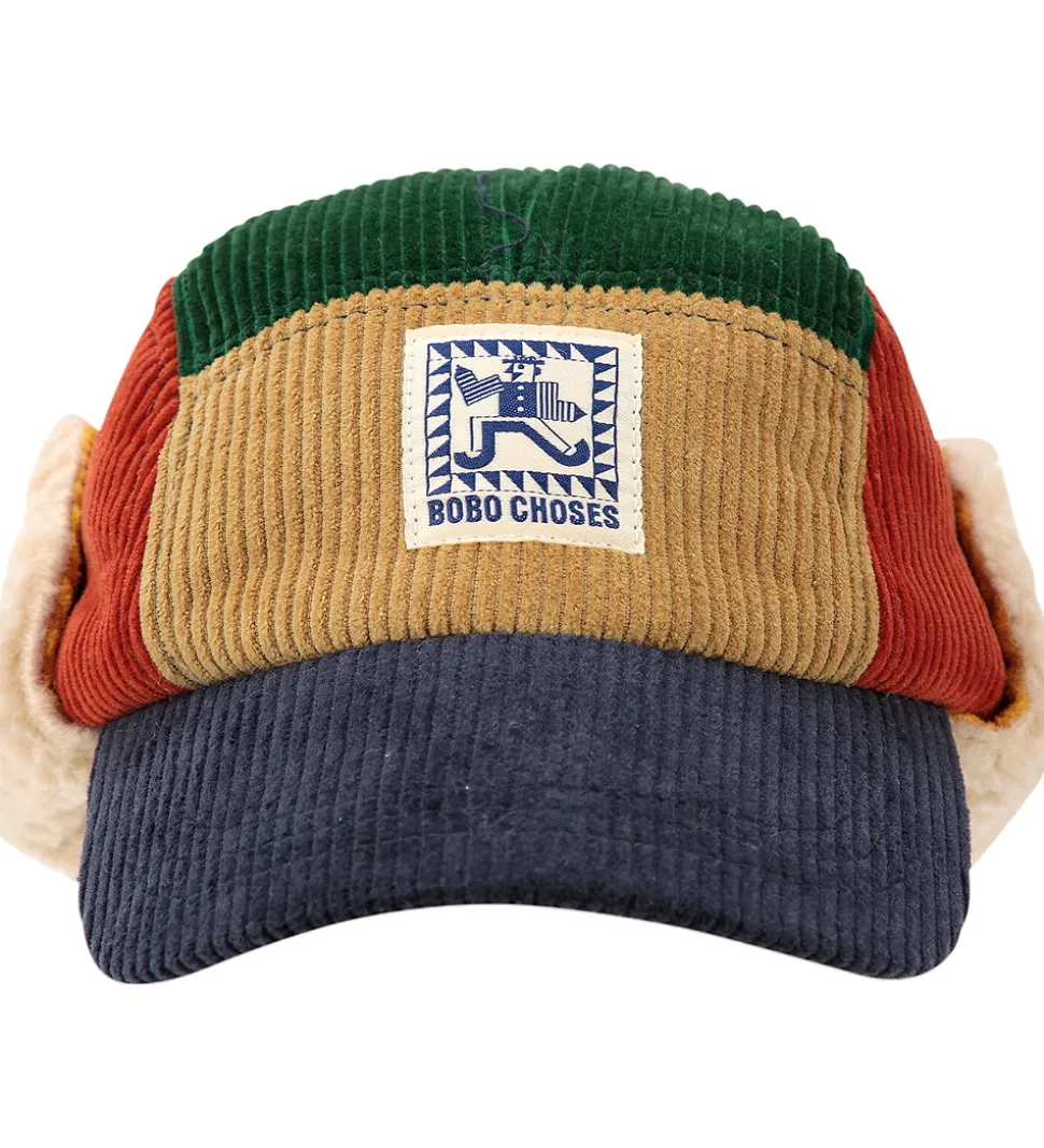 Smart Bobo Choses kasket i grøn, brun, blå, rød og gul fløjl. På fronten ses et tydeligt Bobo Choses logo.