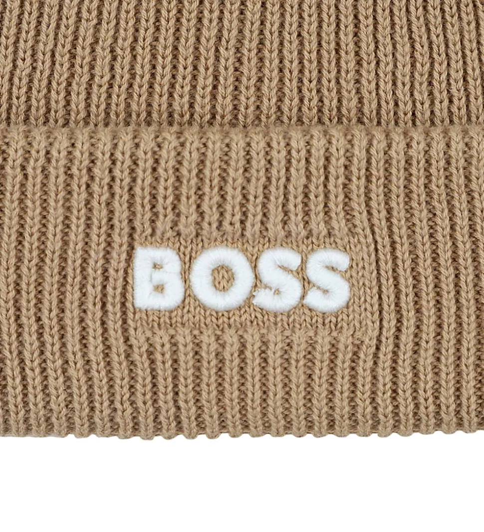 Lækker BOSS hue i lysebrun i en strikket kvalitet og med ribstruktur. Huen har en hvid pompon på toppen, der tilføjer et stilfuldt præg. Fronten prydes af et hvidt BOSS logobrodering. Huen har en spids form, og den består af to lag med et ombuk langs kanten.