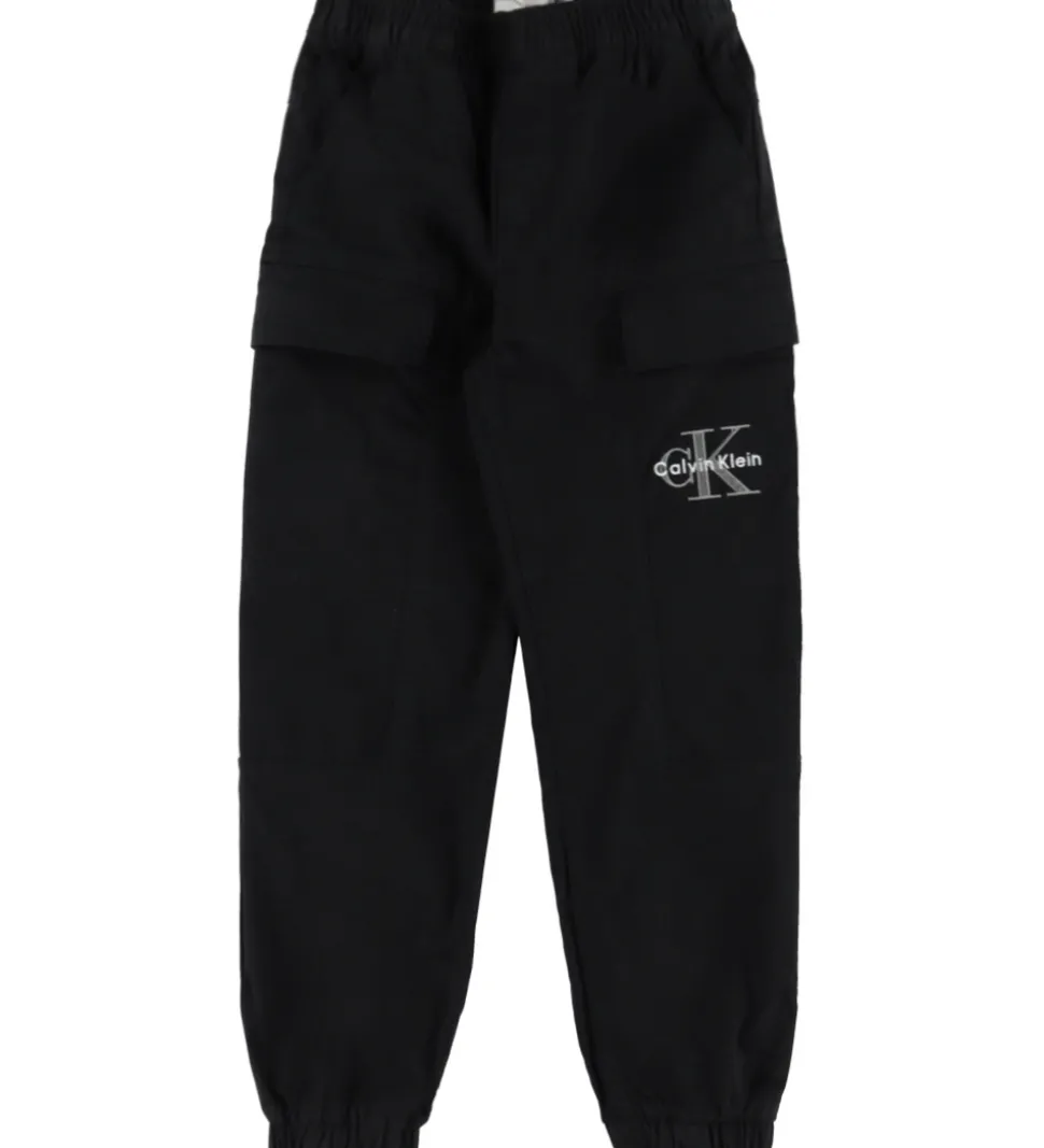 Stilfulde bukser fra Calvin Klein i en klassisk sort farve, i en cargo model. Calvin Klein bukserne har en elastisk talje for en behagelig pasform og praktiske sidelommer med klap. Benene afsluttes med ribkanter, som sikrer en god pasform. Bukserne har et broderet Calvin Klein logo på det ene ben.