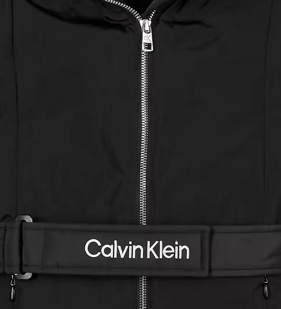 Calvin Klein dynefrakken er en lang model, som går godt ned over numsen. Den har en fast hætte, og ærmerne har praktiske snefang med ribstruktur. Dynefrakken åbnes med en sølvfarvat lynlås med indvendig vindstolpe, og i siderne er der fleeceforede lommer, som lukkes med en skjult lynlås. I livet sidder der et bredt bælte, som justeres med velcro.