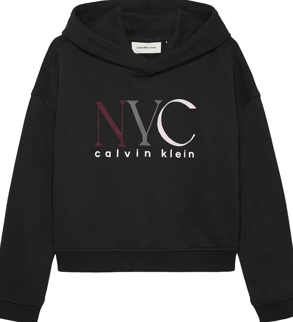 Stilren Calvin Klein hættetrøje i sort med et flot NYC-print på forsiden. Hættetrøjen er designet med ribkanter, og den har en kort, cropped psform. På indersiden har hættetrøjen blødt, børstet bomuld.
