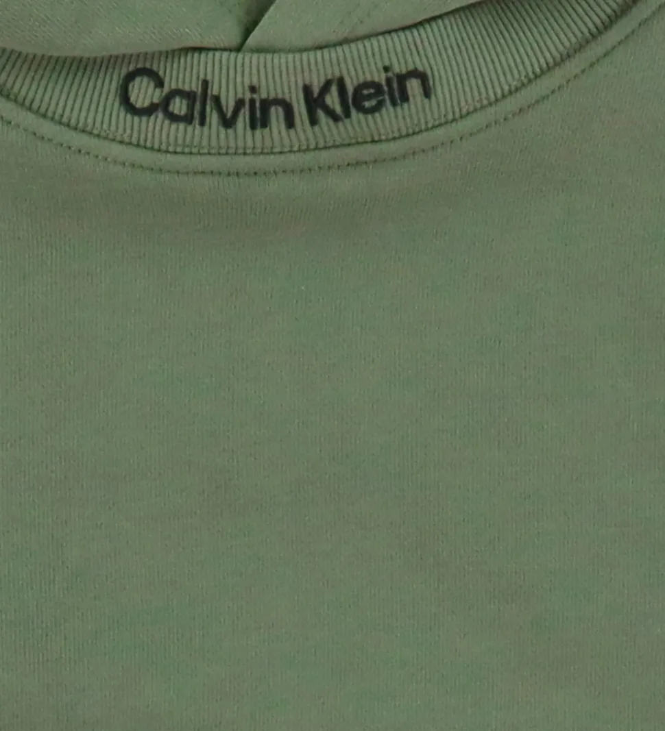 Smart hættetrøje fra Calvin Klein i armygrønt sweat, og fortil i halsåbningen står der “Calvin Klein” broderet i sort. Hættetrøjen har lange ærmer og en praktisk hætte med et bomuldsfor. Hele vejen rundt i halsåbningen er der en smal ribkant.