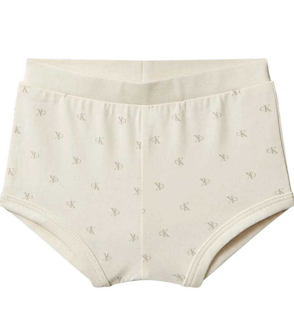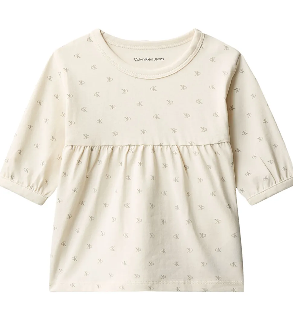 Elegant Calvin Klein sæt bestående af en kjole og et par bloomers. Sættet er i en sart beige nuance med et delikat all-over mønster af små CK-logoer. Calvin Klein kjolen har lange ærmer og en rund halsudskæring. Bloomersene har smalle bred elastikkant som giver en god pasform.