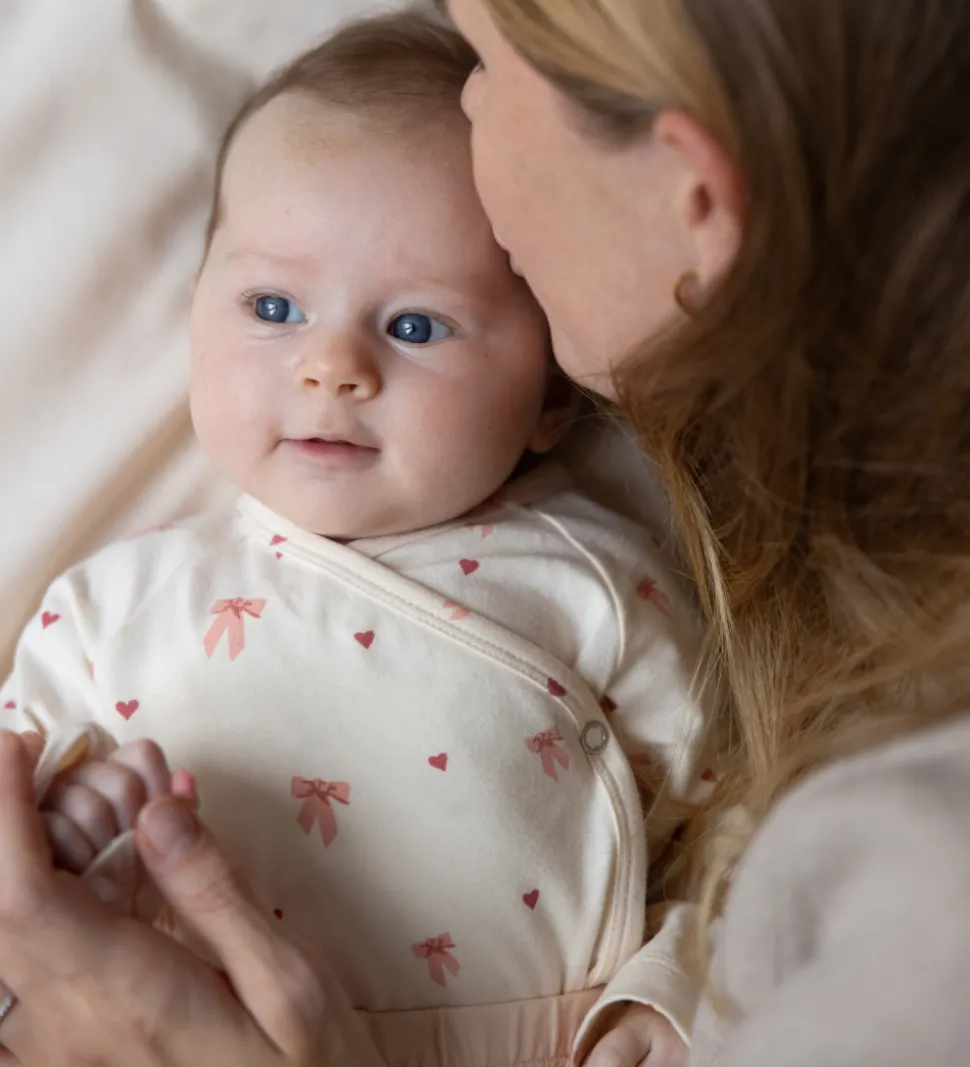 Fin Cam Cam body i lys rosa med print af rosa sløjfer og røde hjerter. Bodyen har lange ærmer og et praktisk slå-om design med trykknapper langs siden samt mellem benene.