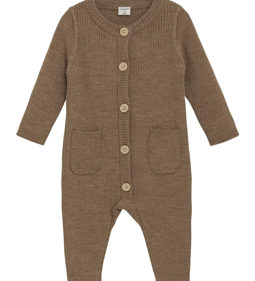 Elegant CeLaVi heldragt i en enkel brun farve i en strikket kvalitet med ribstruktur, og den er lavet af blødt og lækkert merinould.