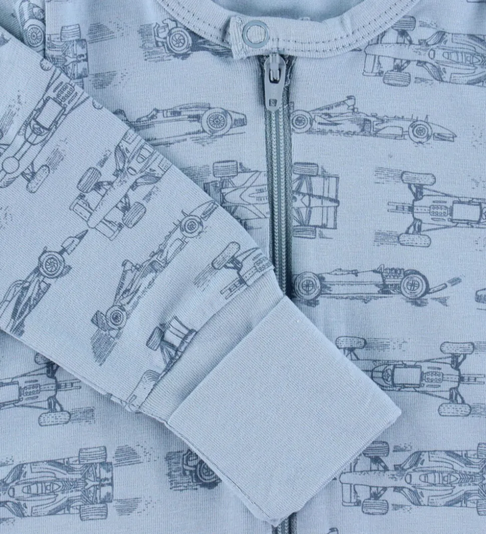 Flot CeLaVi natdragt i luseblå med print af racerbiler i mørkeblå. Natdragten har en rund halsudskæring med en trykknap fortil. Den har lange ærmer og ben, og lukkes fortil med en lynlås med to skydere. Natdragten har mulighed for ombuk til lukkede hænder og fødder.
