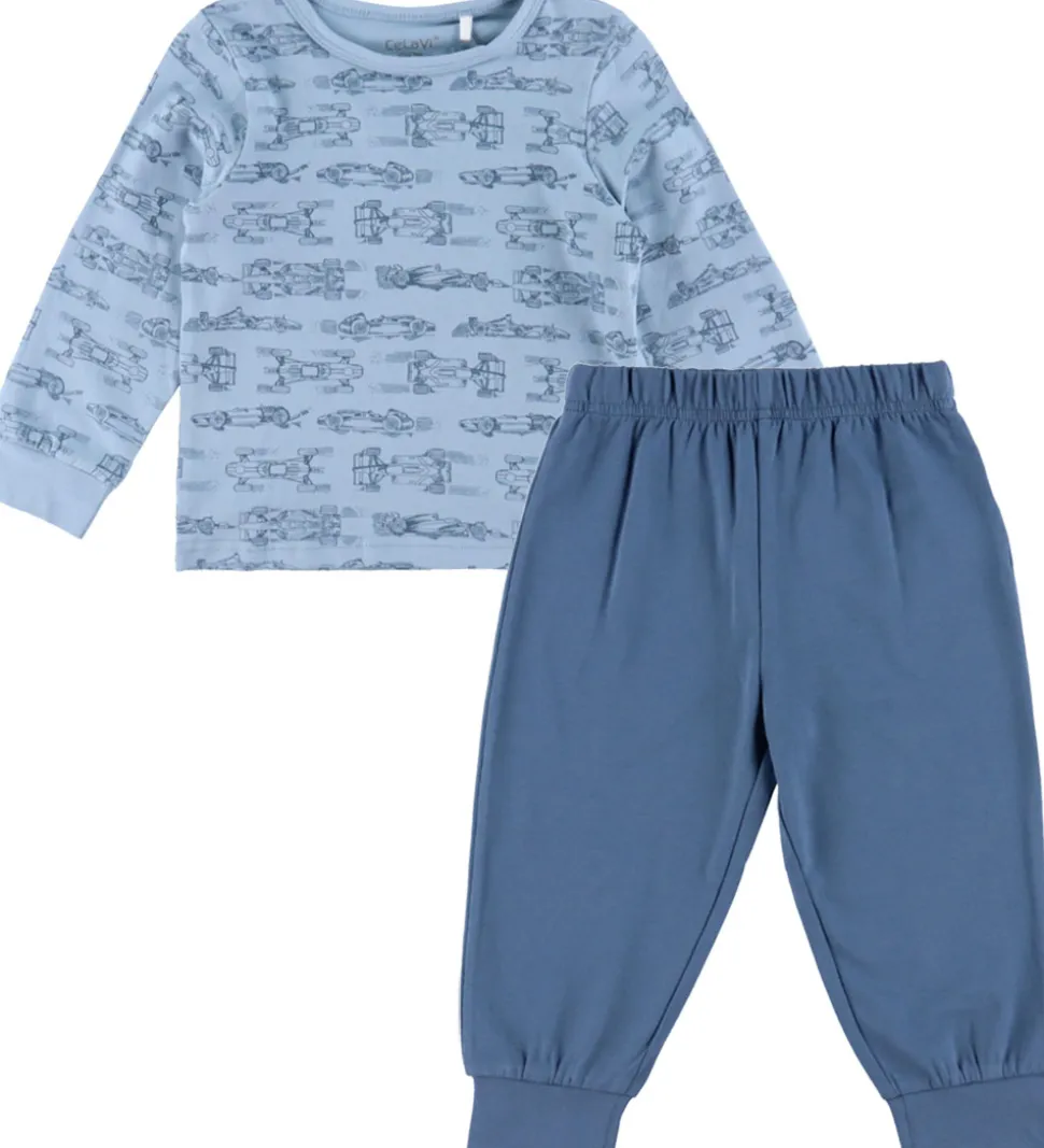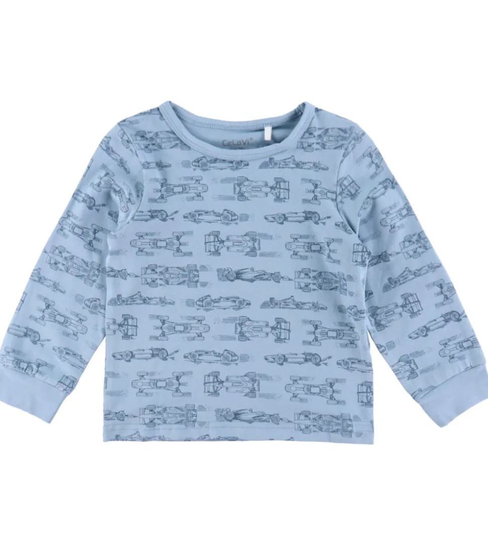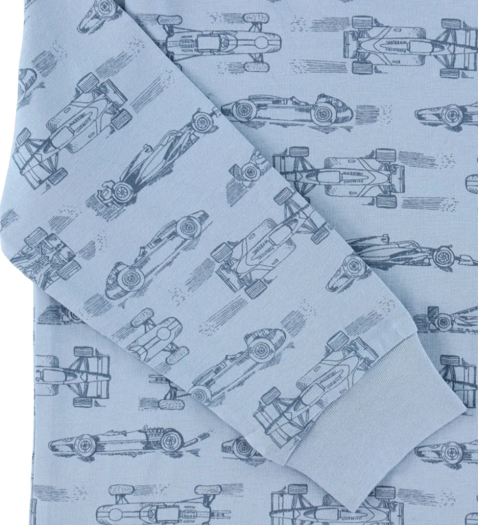 Flot CeLaVi nattøj i lyseblå og mørkeblå bestående af en natbluse og et par natbukser. Natblusen har et alloverprint af racerbiler i mørkeblå. Den har en rund halsudskæring og lange ærmer med brede ribkanter ved håndleddene. Natbukserne er ensfarvede med en god elastikkant i taljen og brede ribkanter ved anklerne.