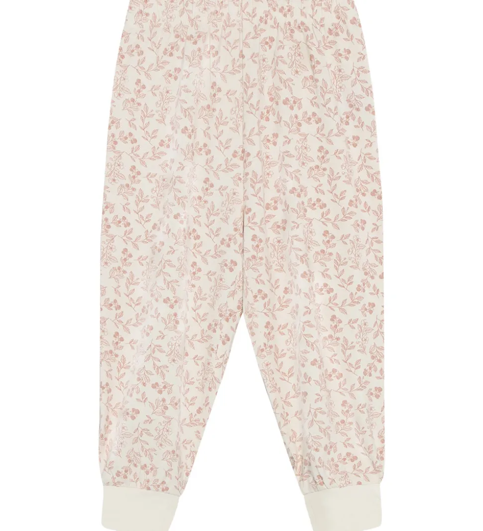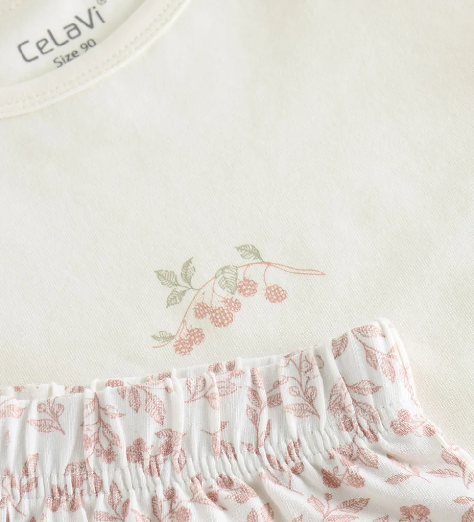 Sødt CeLaVi nattøj i hvid og rosa bestående af en natbluse og et par natbukser. Natblusen har et lille print af bær på brystet og lange ærmer med rynker ved skuldrene. Natbukserne har et alloverprint af bær, blomster og blade. I taljen er der en god elastik, og i benåbningerne er der brede ribkanter.