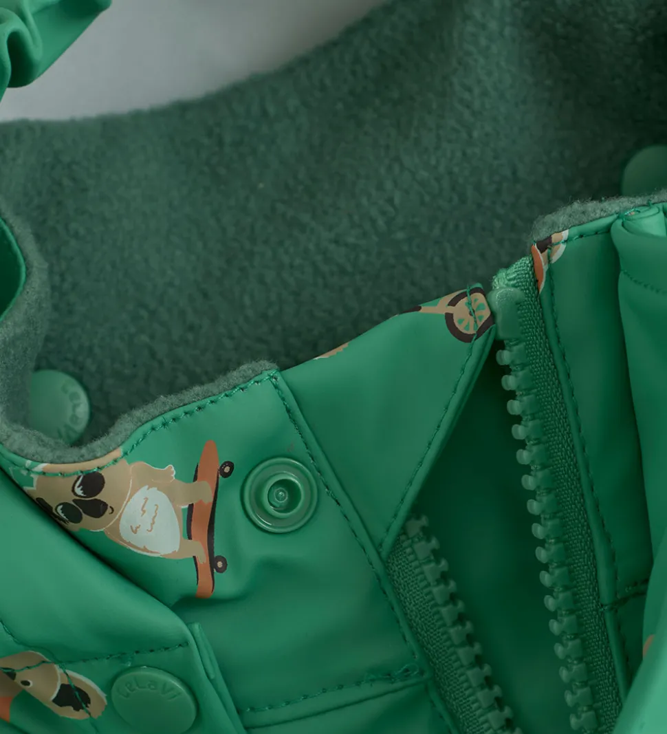 Skøn CeLaVi regndragt i grøn PU med print af skaterkoalaer.