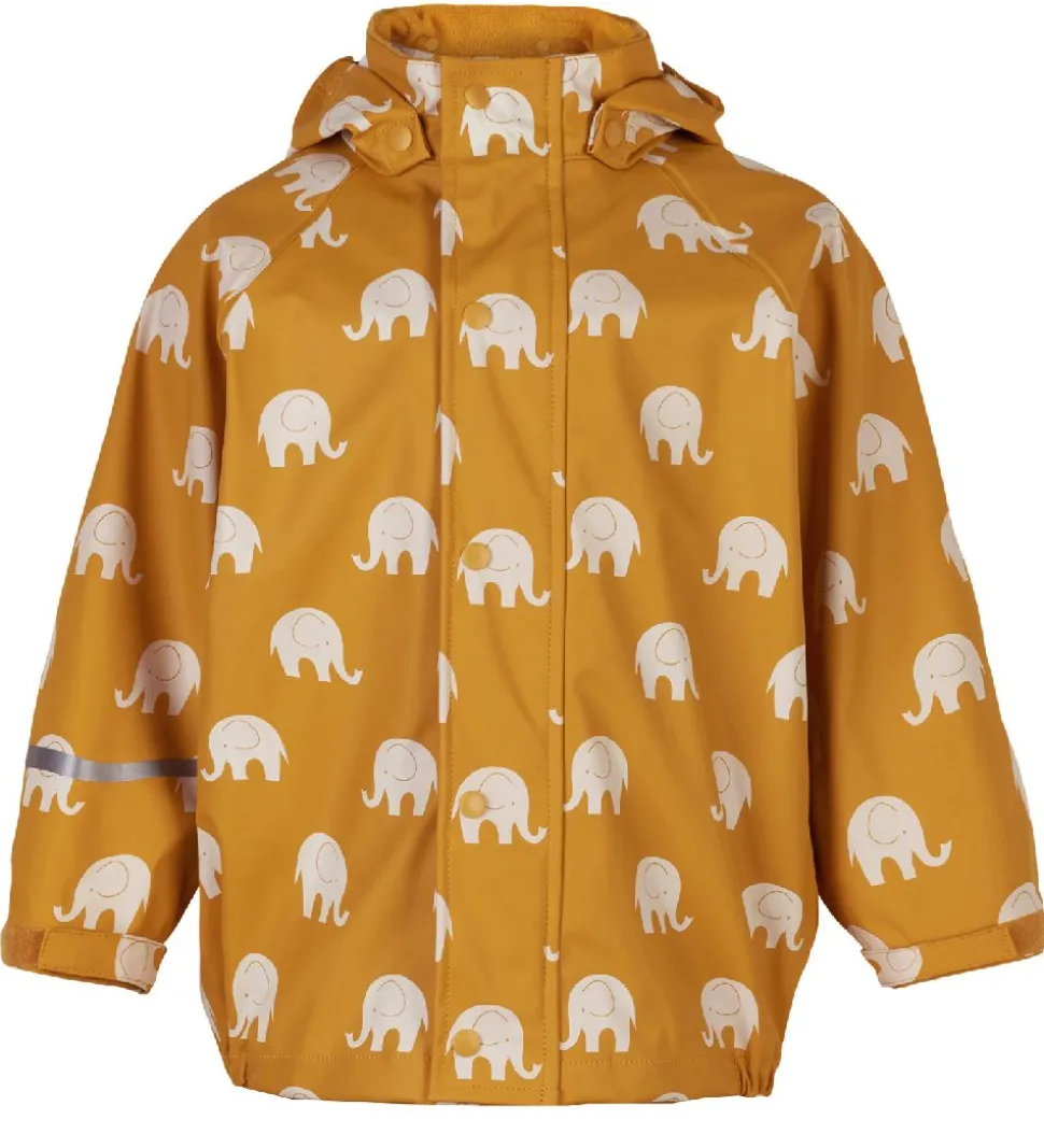 Skønt CeLaVi regntøj i PU, der består af en regnjakke i gul med hvide elefanter samt et par regnbukser i ensfarvet gul med seler.