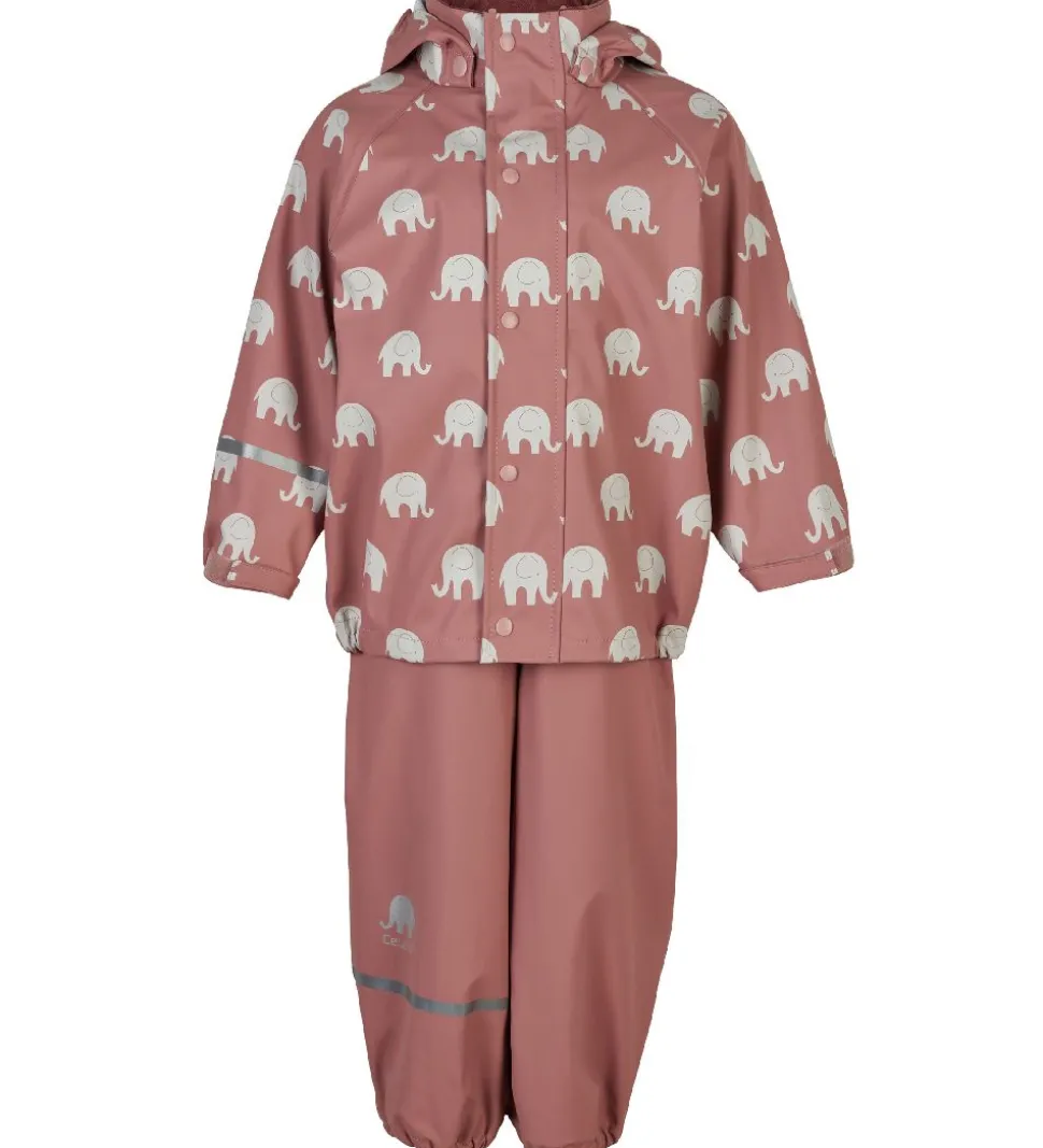 Sødt CeLaVi regntøj i PU, der består af en regnjakke i støvet rosa med hvide elefanter samt et par regnbukser i ensfarvet støvet rosa.
