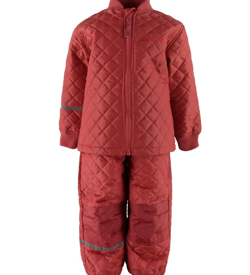 Lækkert CeLaVi termotøj i en flot rød nuance, og sættet består af en termojakke og et par termobukser. På jakken er navnet “CeLaVi” broderet øverst til venstre.