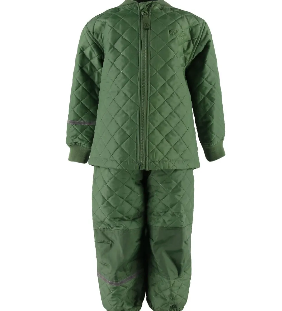 Flot CeLaVi termotøj i en armygrøn, og sættet består af en termojakke og et par termobukser. På jakken er navnet “CeLaVi” broderet øverst til venstre.