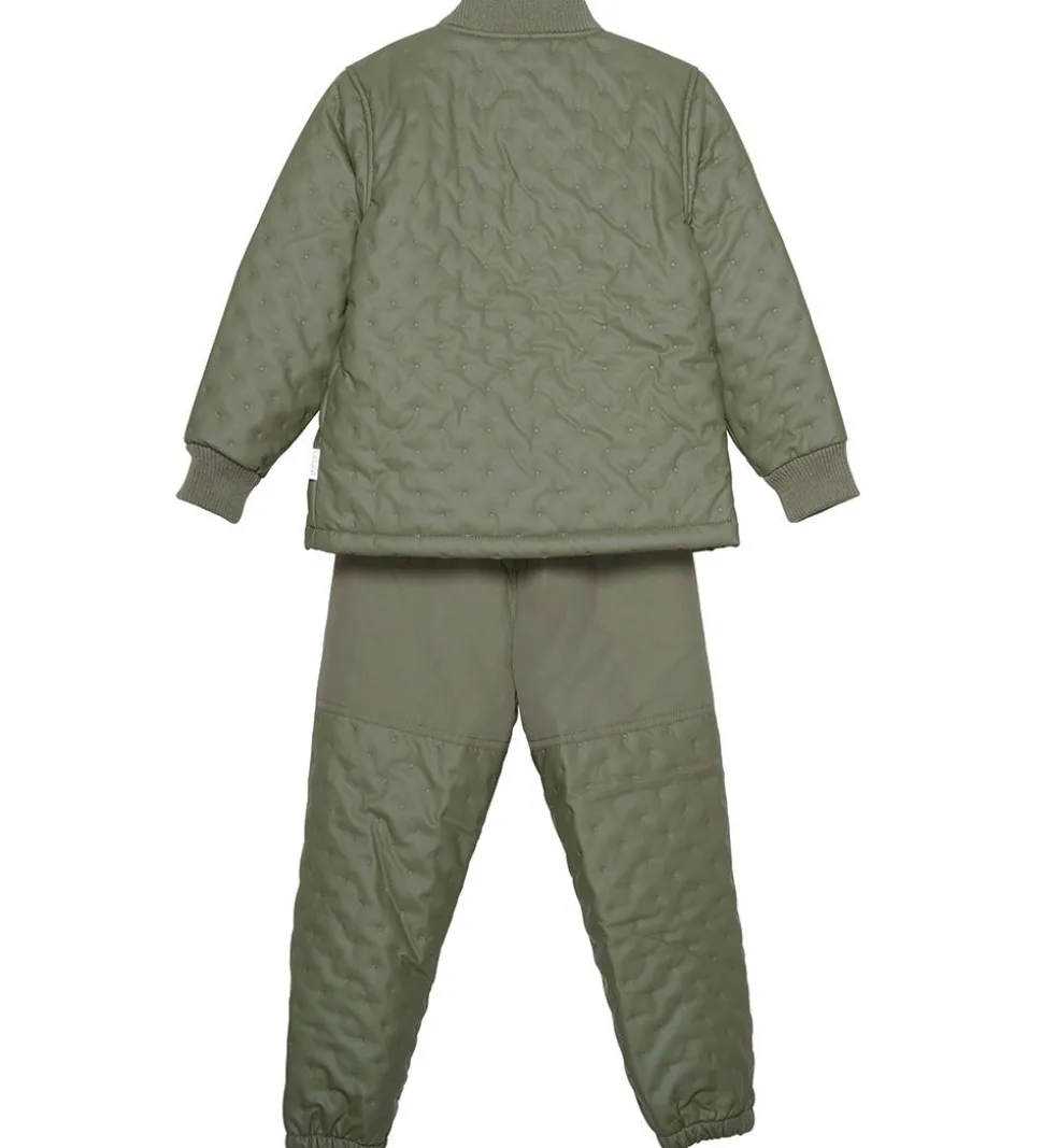 Lækkert CeLaVi termotøj i armygrøn med et indpræget prikmønster af stjerner, der giver det en quiltet struktur. Sættet består af en termojakke og et par termobukser med en praktisk PU-coating og fleeceforing.