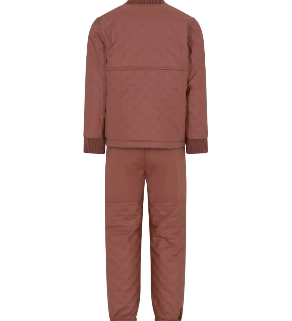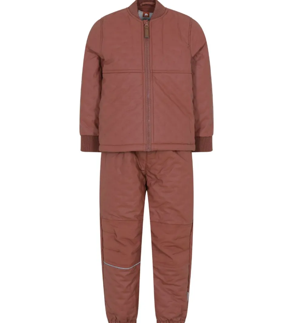 Flot CeLaVi termotøj i rødbrun. Sættet består af en termojakke og et par termobukser med en praktisk PU-coating og fleeceforing.