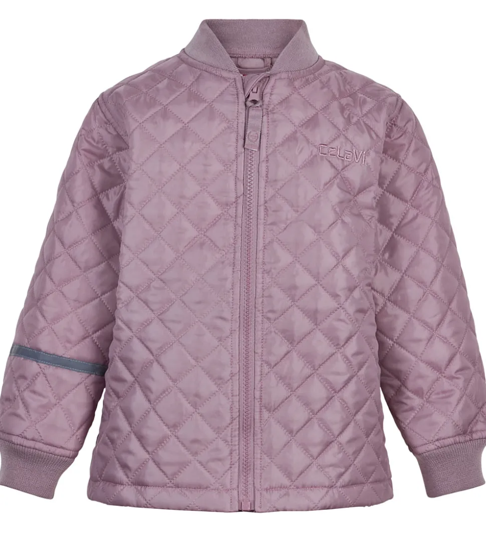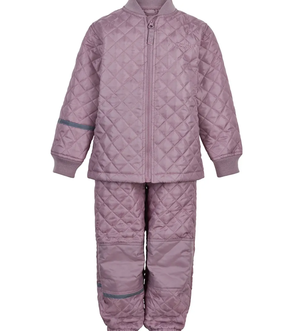 Lækkert CeLaVi termotøj bestående af en termojakke og et par termobukser i støvet lilla med en quiltet struktur. På termojakkens venstre bryst er navnet “CeLaVi” broderet på.