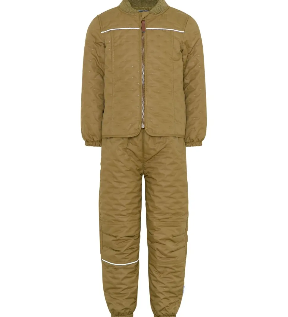 Fint CeLaVi termotøj bestående af en termojakke samt et par termobukser i støvet armygrøn. Termotøjet har et prikmønster af små stjerner, som er præget ind i termotøjets stof og giver det en quiltet struktur.