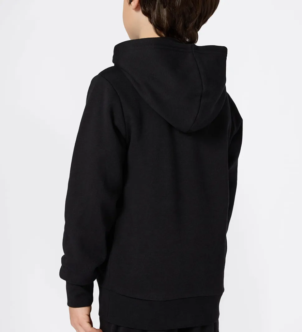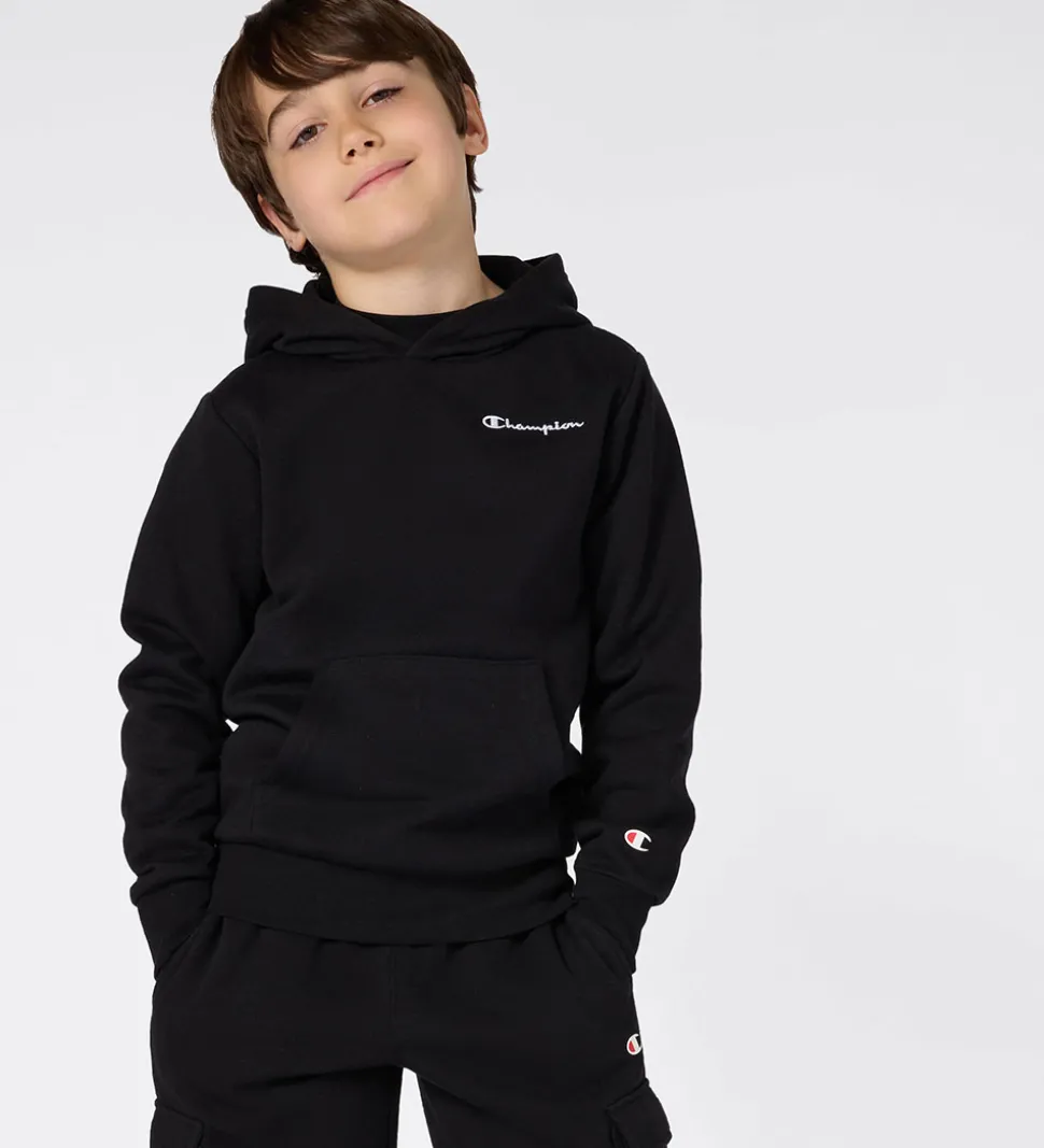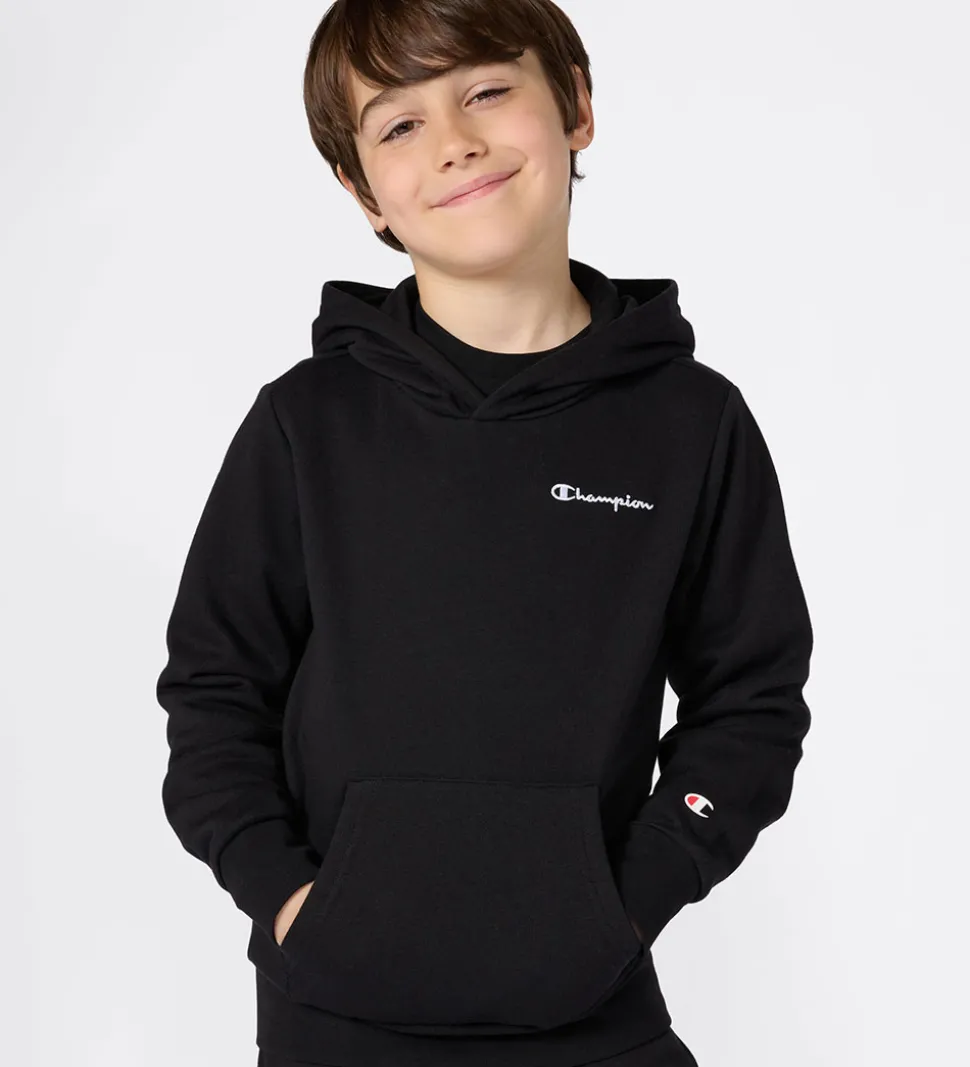 Stilfuld Champion hættetrøje i klassisk sort med et diskret, broderet Champion logo på brystet i hvid. Hættetrøjen har en rummelig kængurulomme foran. Ved ærmets afslutning ses et lille Champion emblem. Ribkanter ved håndleddene giver hættetrøjen et enkelt udtryk. På indersiden har hættetrøjen blødt, børstet bomuld.