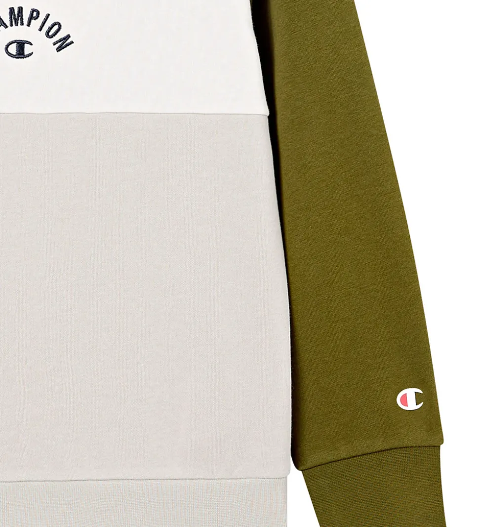 Stilfuld Champion hættetrøje i en flot kombination af mørkegrøn, råhvid og lysegrøn. Hættetrøjen har et enkelt logoprint på brystet og et lille logo på ærmet. Champion hættetrøjen har en blød hætte og ribkanter ved håndleddene og i livet, som giver en god pasform. Indvendigt er der blødt, børstet bomuld.