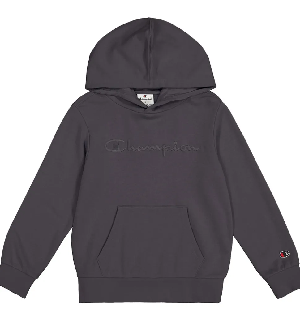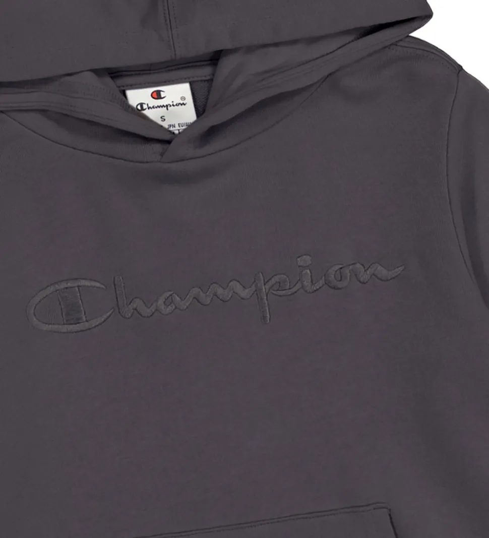 Smart Champion hættetrøje i en mørkegrå farve med et stort logoprint broderet på fronten. Denne hættetrøje har lange ærmer og en praktisk kængurulomme på maven, der giver ekstra komfort.