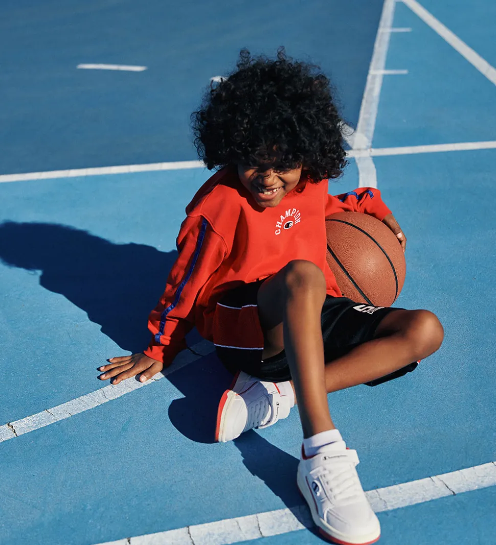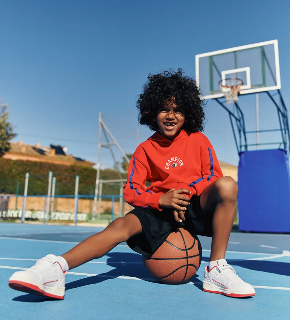 Lækker Champion hættetrøje i en rød farve med blå kontraststriber på ærmerne og et stort logoprint broderet på fronten i hvid, samt har den en smart kængurulomme. Denne hættetrøje kombinerer stil og komfort til børn.