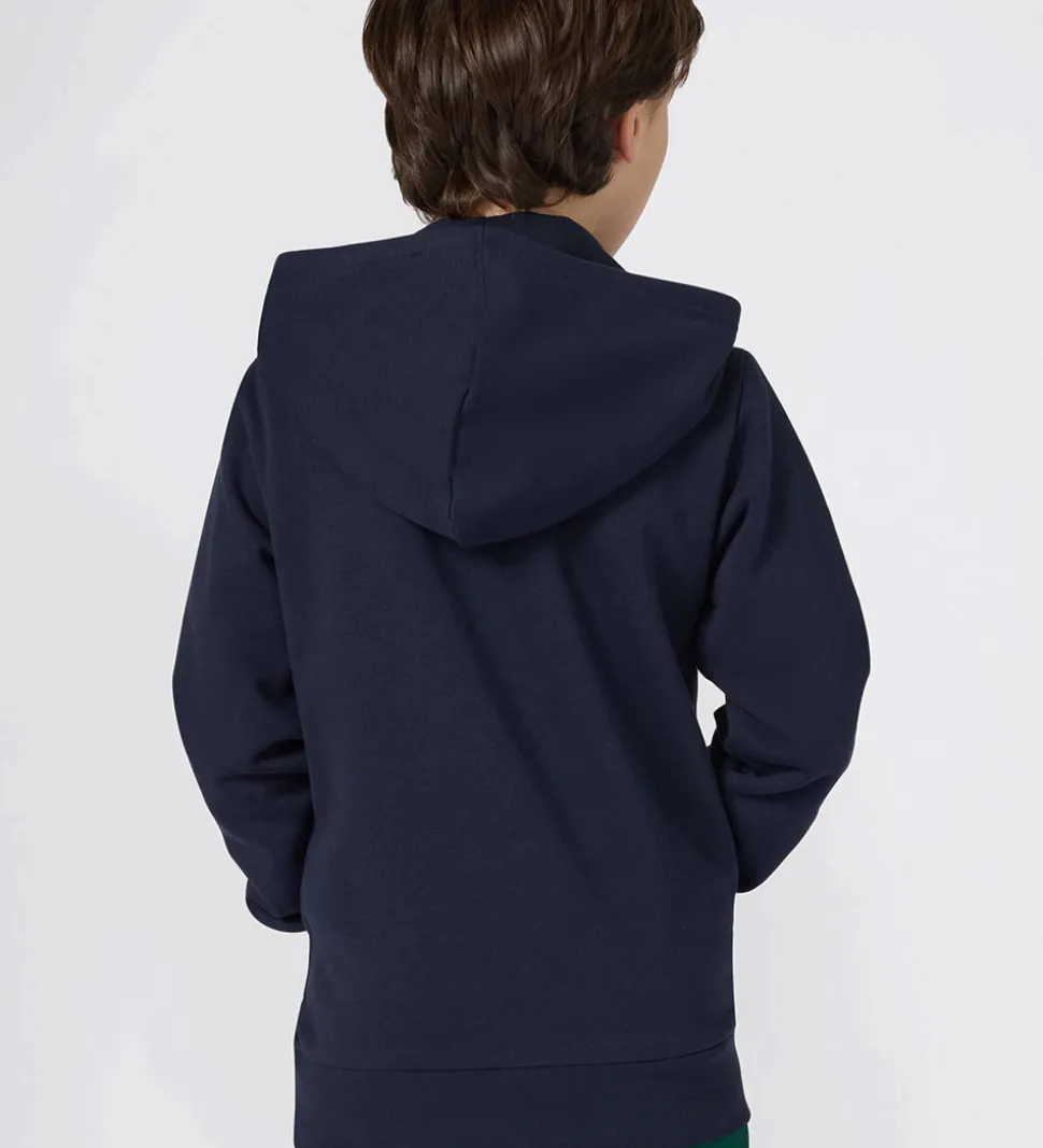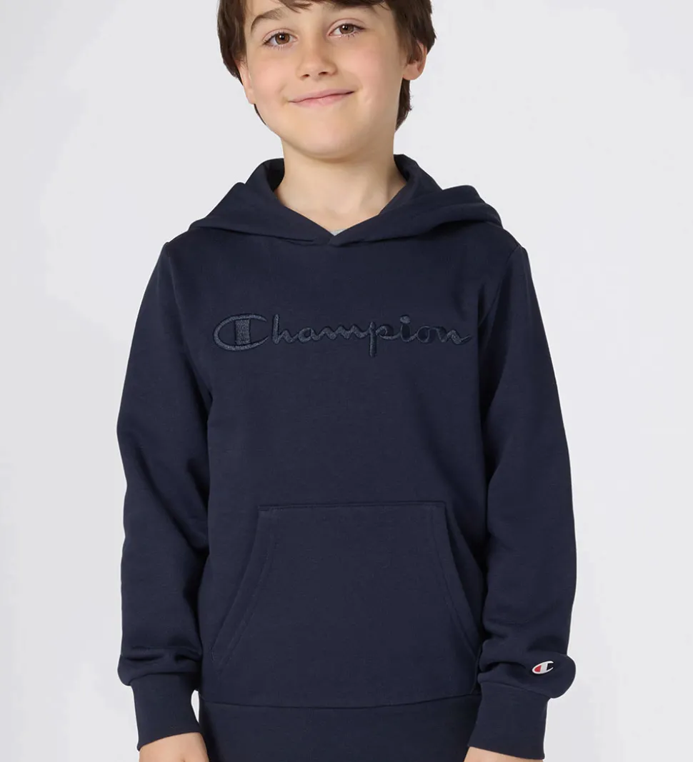 Stilfuld Champion hættetrøje i en dyb marineblå farve med et elegant, tone-i-tone broderet logo på fronten. Champion hættetrøjen har en praktisk kængurulomme og brede ribkanter ved håndleddene og forneden. Hættetrøjen har en rummelig hætte, der giver et afslappet look. Hættetrøjen har blødt, børste bomuld på indersiden.