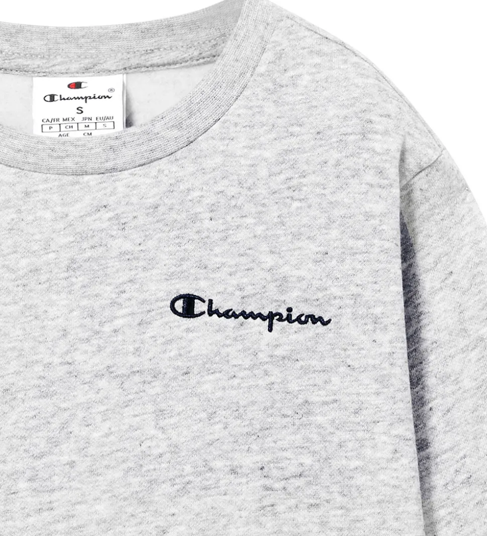 Skøn Champion sweatshirt i gråmeleret med det klassiske Champion-logo broderet i nayblå på venstre bryst. Champion sweatshirten har lange ærmer og ribkanter ved alle åbninger. Indvendigt er der blødt, børstet bomuld.