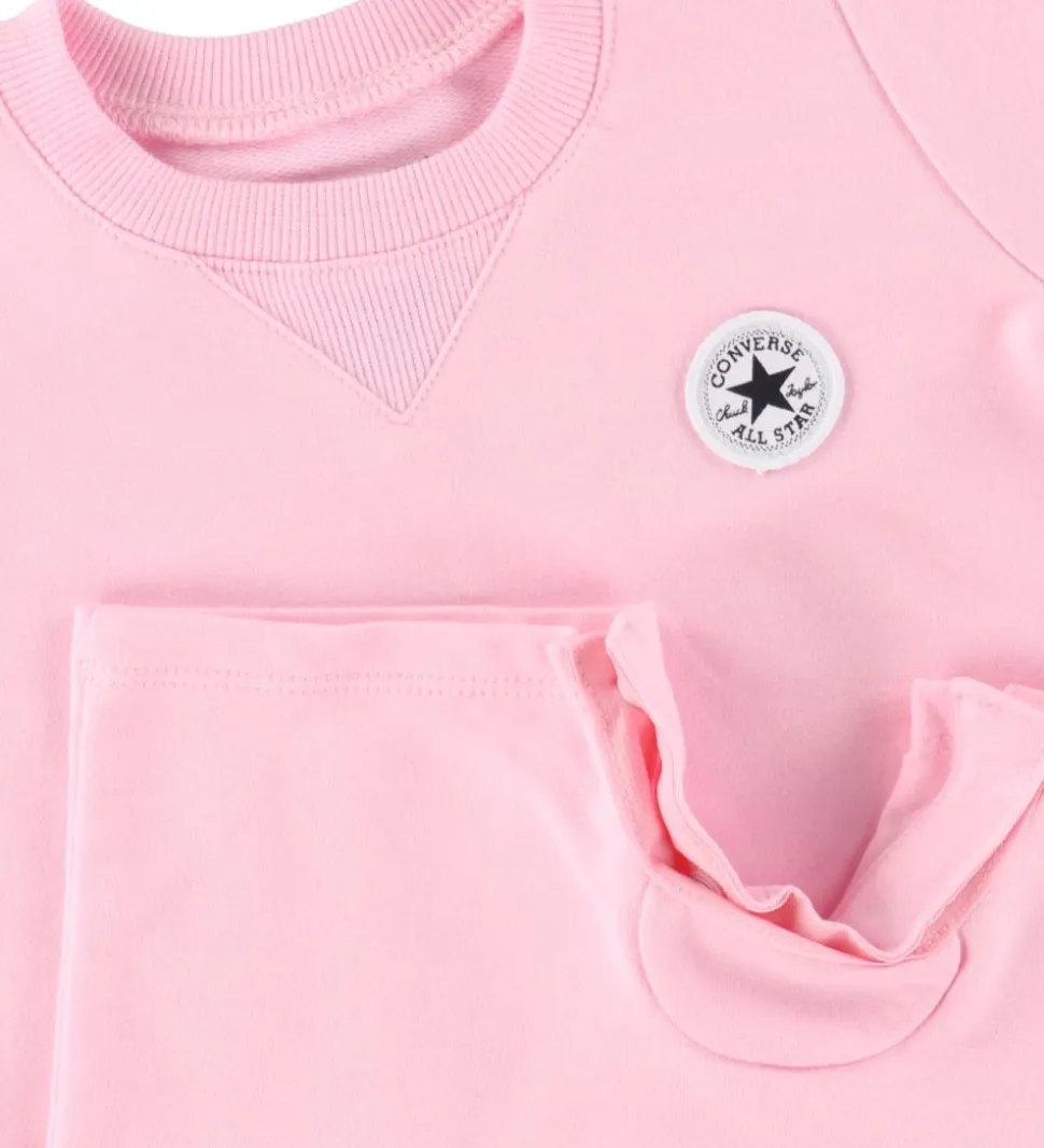 Sødt Converse sæt bestående af en sommerdragt og et par strømper i lyserød med logo. Strømperne er printet som en Converse-sko med en hvid bund og hvide snørebånd.