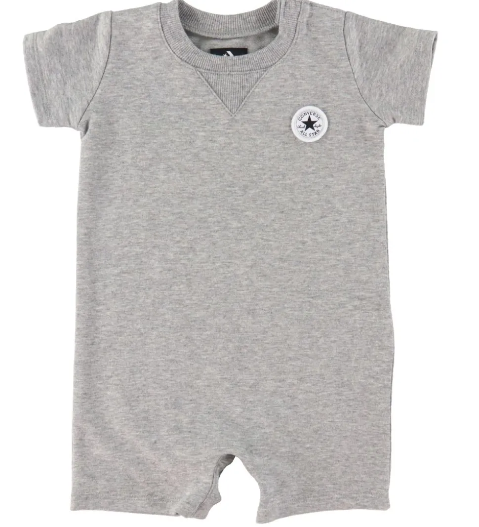Skønt Converse sæt bestående af en sommerdragt og et par strømper i meleret grå med logo. Strømperne er printet som en Converse-sko med en hvid bund og hvide snørebånd.
