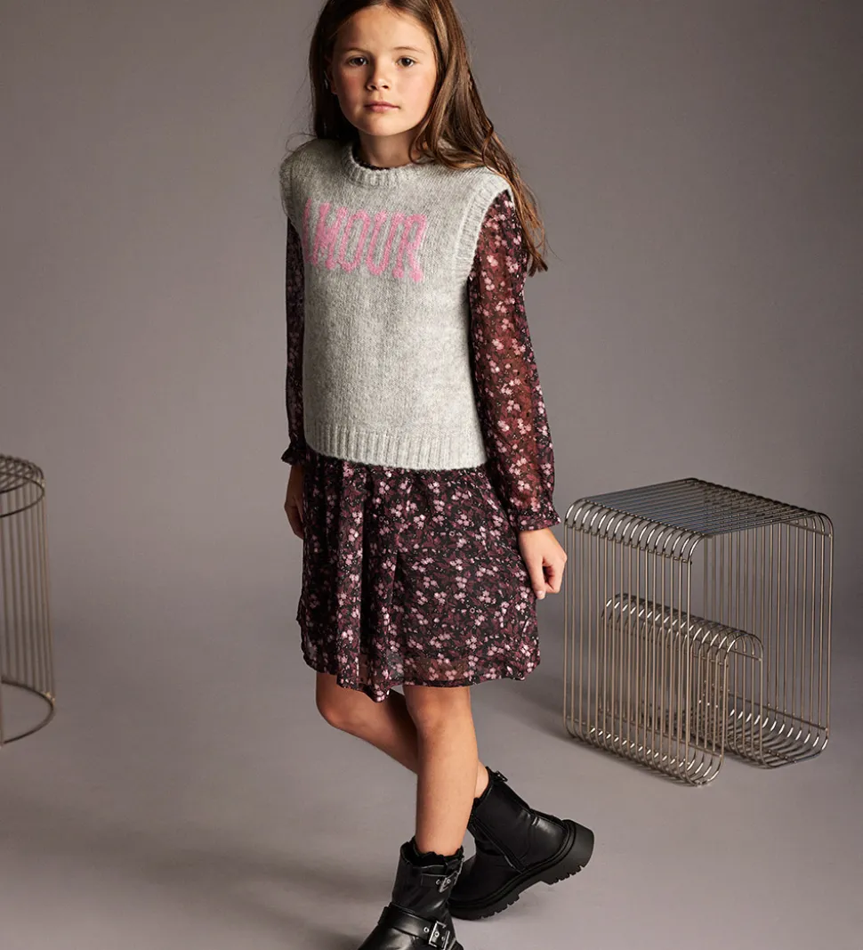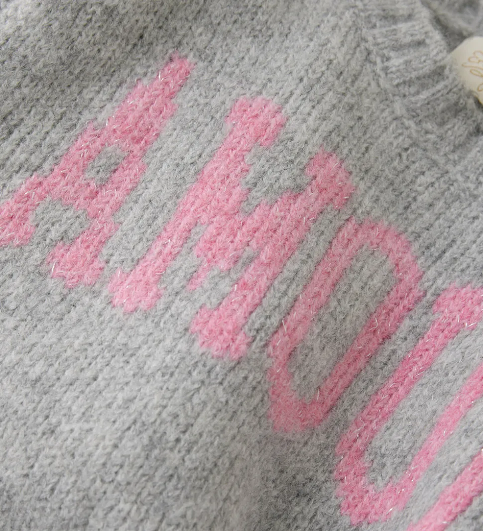 Smart Creamie vest strikket i en lys grå nuance med et stort “AMOUR” print på fronten i rosa. Creamie vesten er ærmeløs og har en klassisk pasform, der fremhæver det stilfulde design.