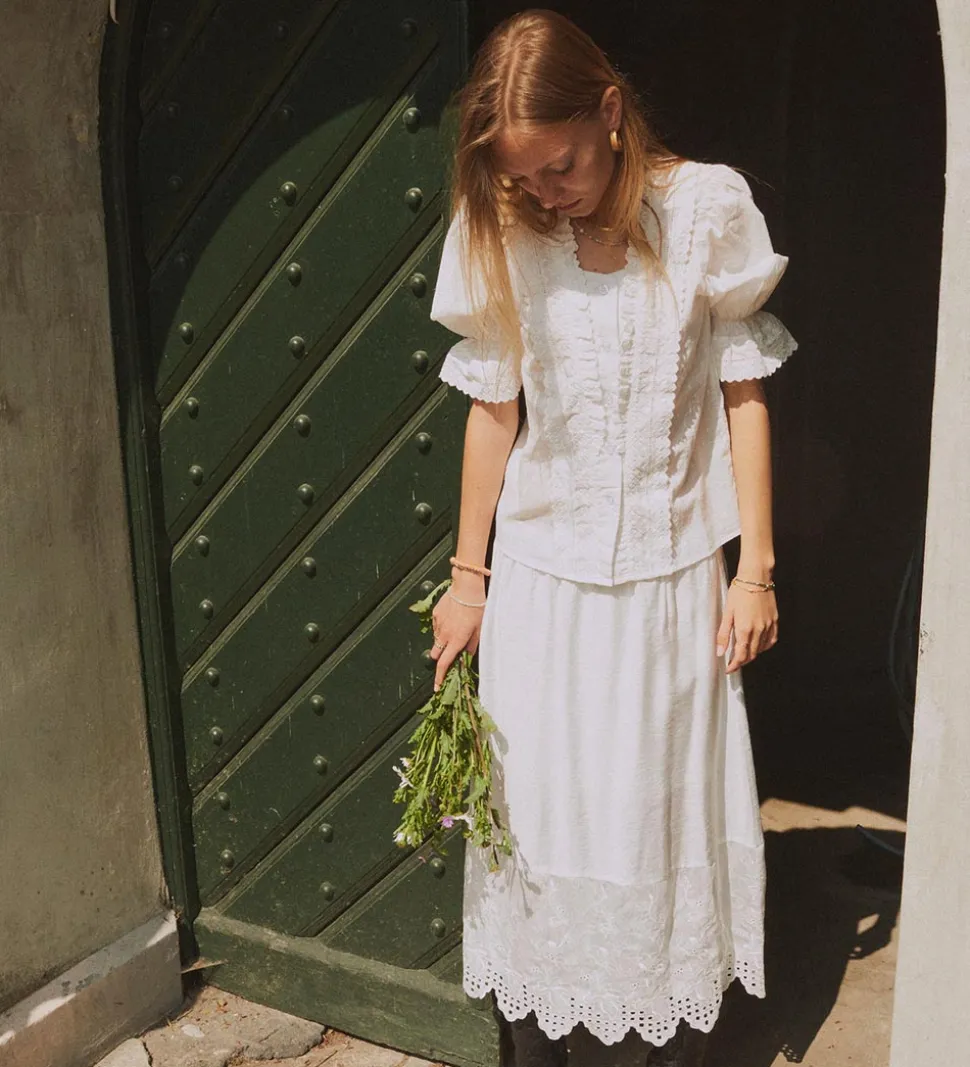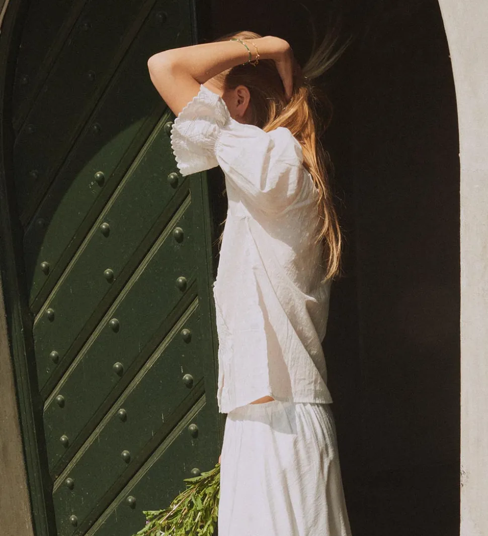 Designers Remix skjorten har mellemlange ærmer med en let pufeffekt og flotte blonder i åbningerne. I halsåbningen og ned langs kroppen fortil er der fine hvide blonder. Skjorten åbnes med gennemgående knapper fortil, og den er lavet i en blød og let bomuldskvalitet.