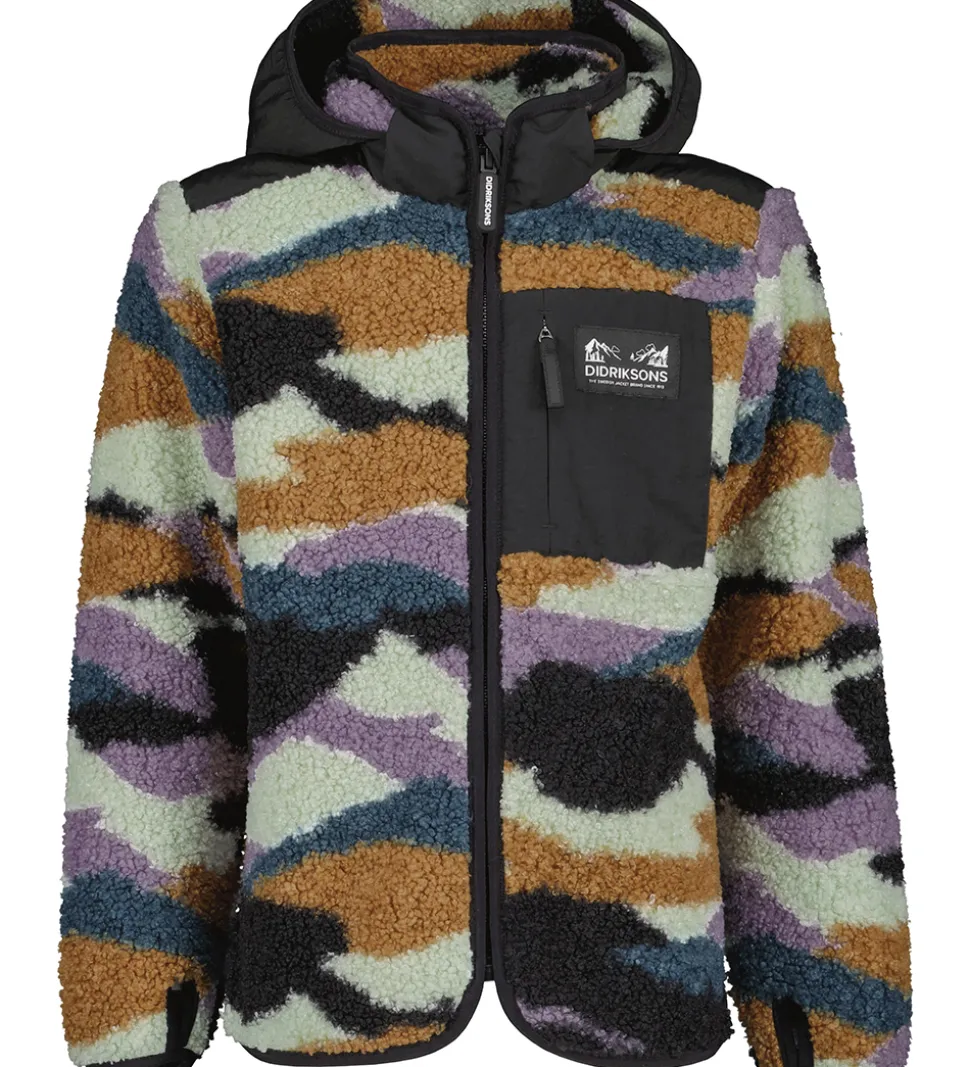 Dejlig Didriksons fleecejakke i brune, lilla, grønne og navyblå nuancer i teddyfleece med sorte, glatvævede detaljer. På venstre bryst er der en sort logopatch med en lomme der åbnes ved hjælp af en lynlås.