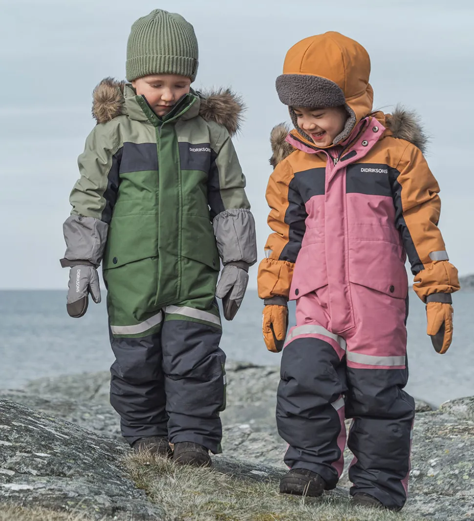 Flot Didriksons flyverdragt i pink, karrygul og navyblå og med et broderet, hvidt logo på venstre bryst. Flyverdragten har velplacerede, praktiske reflekser.