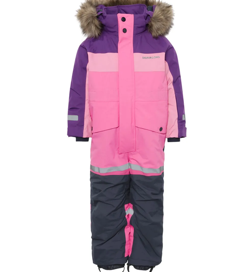 Flot Didriksons flyverdragt i pink, rosa og lilla og med et broderet, hvidt logo på venstre bryst. Flyverdragten har velplacerede, praktiske reflekser.