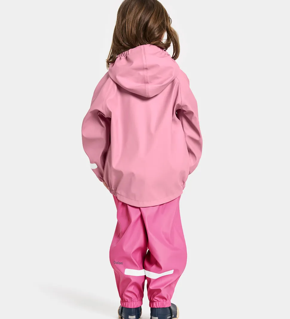 Flot Didriksons regntøj, der består af en regnjakke og et par regnbukser i to forskellige nuancer af rosa. Regntøjet er lavet af PU.