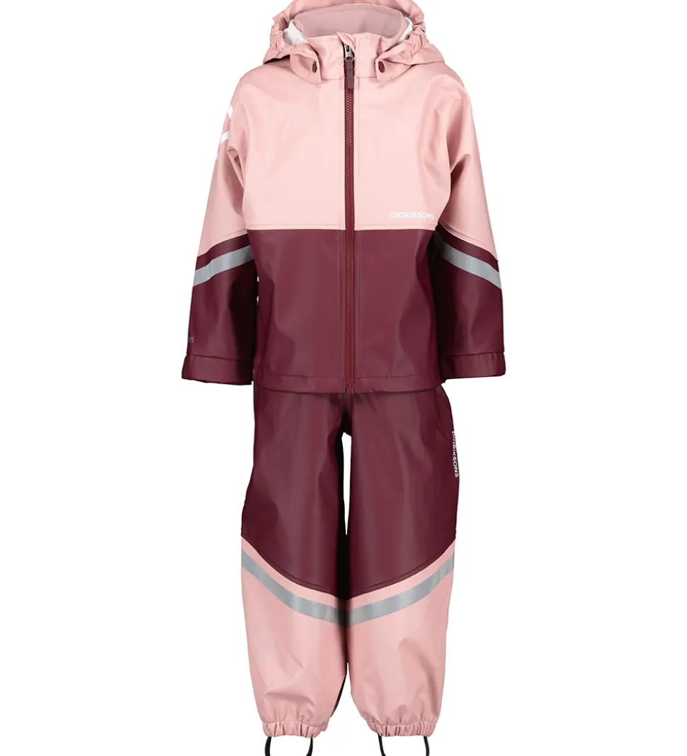 Fint Didriksons regntøj i rosa nuancer. Regnsættet består af et par regnbukser med seler og en regnjakke. Regntøjet er i materialet Galon® og har både logo- og refleksprint.