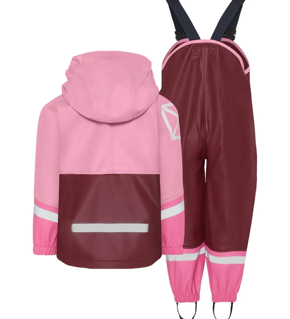 Flot Didriksons regntøj, der består af en regnjakke og et par regnbukser med seler i rosa nuancer og lilla detaljer. Regntøjet er lavet af PU.