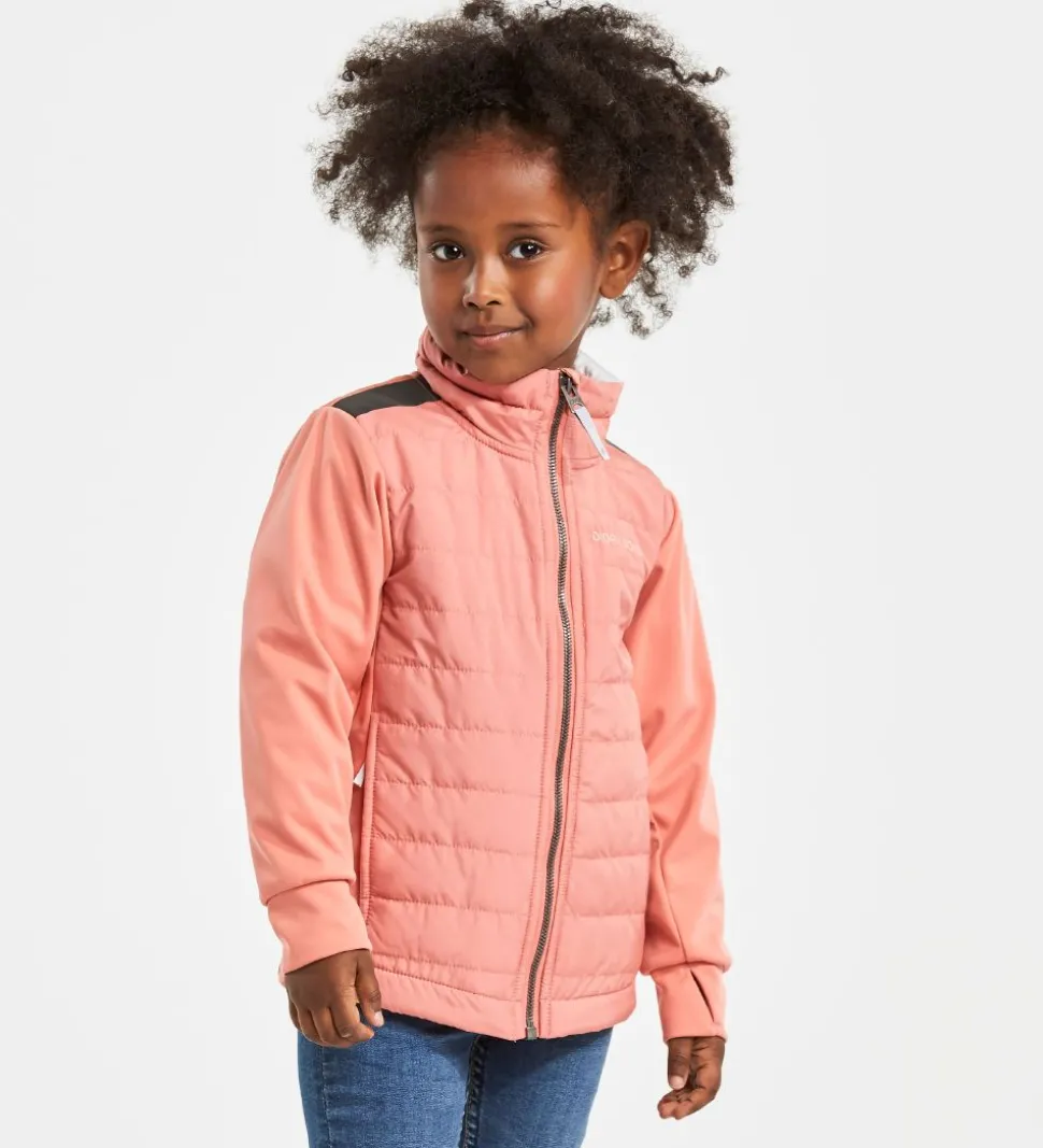 Lækker Didriksons softshelljakke i koralrosa med sorte skulderstykker. Softshelljakken er en hybrid mellem softshell og termo. Jakkens krop er vatteret og med vandrette syninger som en termojakke, mens ærmerne er klassisk softshell.