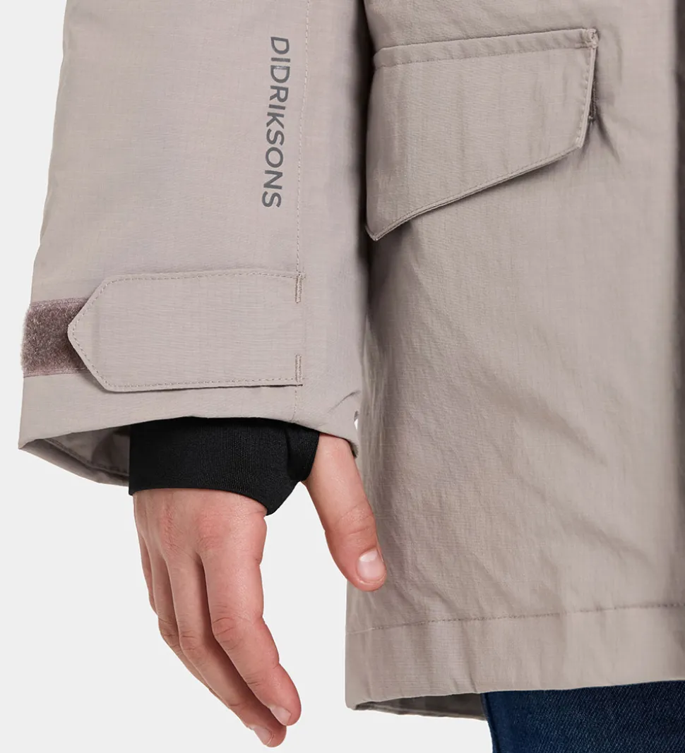 Ved ærmerne er der praktiske snefang med brede, strækbare kanter og et lille hul til tommelfingeren, og ærmekanten kan strammes ind med en velcrorem. På indersiden ved ærmekanten er der en praktisk plastring, som Didriksons handsker og luffer kan hægtes på.