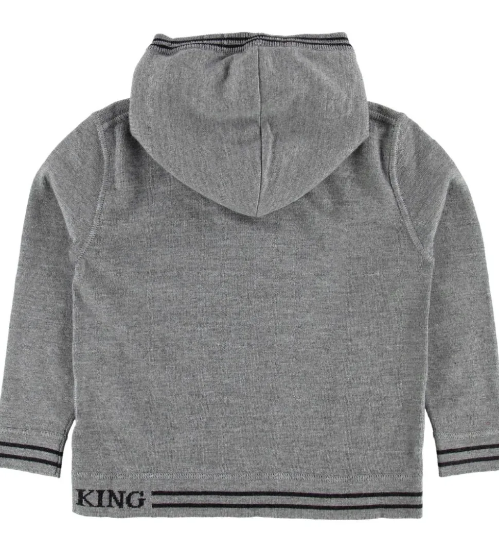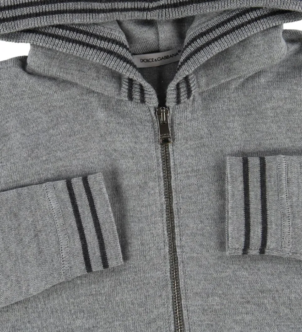 Lækker Dolce & Gabbana cardigan i gråmeleret uld i en let, strikket kvalitet. Langs kanterne er der to smalle, koksgrå striber samt navnet “Dolce & Gabbana” i koksgrå.